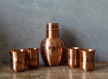This copper carafe set includes a beautifully crafted carafe paired with matching cups, designed for serving beverages in style. Made from high-quality copper, it offers excellent thermal properties to help maintain drink temperature. The elegant design combines traditional craftsmanship with modern usability, making it ideal for both everyday use and special occasions. Its durable construction ensures long-lasting performance, while the smooth finish adds a touch of sophistication to any table setting. Perfect for serving water, juice, or traditional drinks with an expert touch.