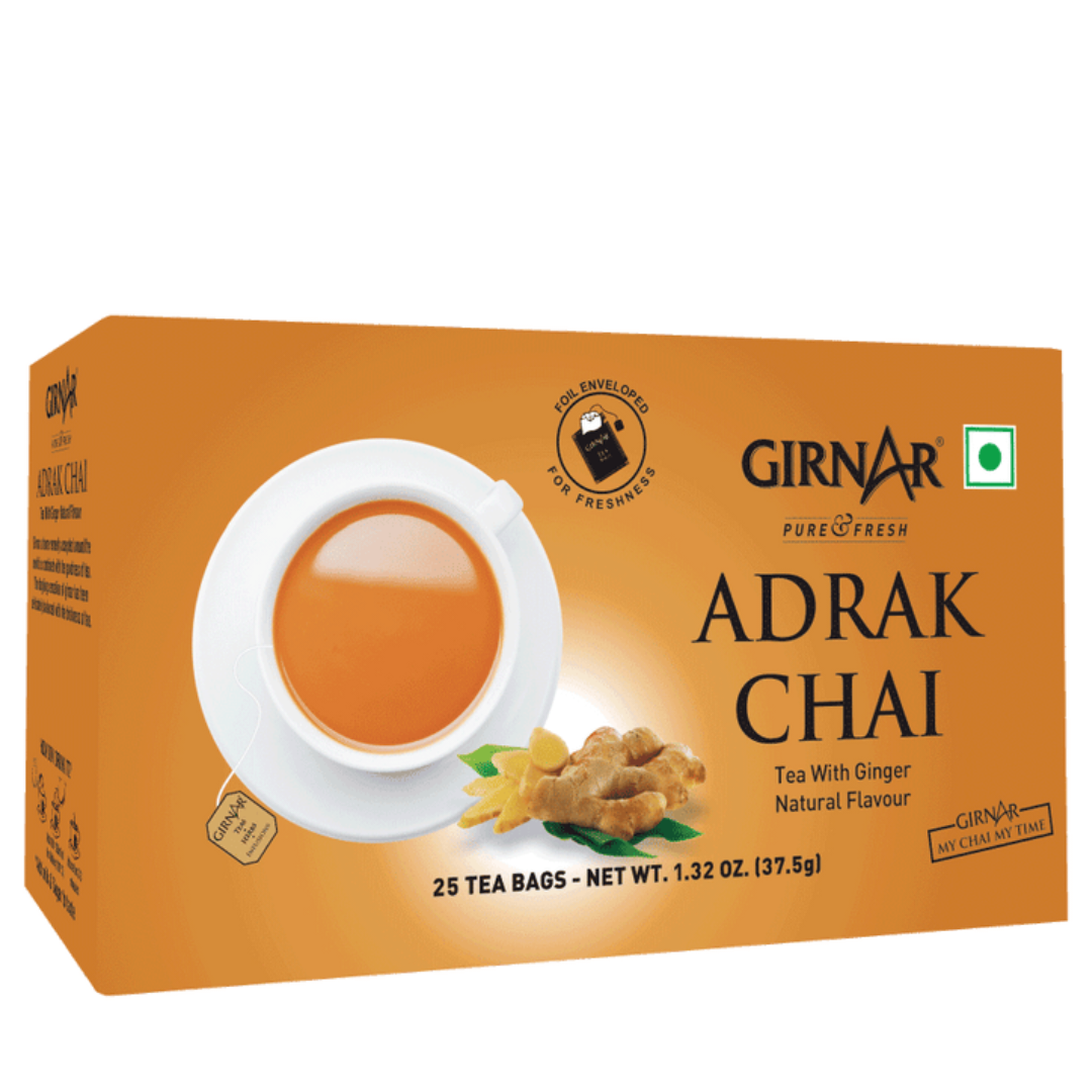 Experience the well-known zest of Ginger combined with a steaming cup of traditional Desi chai for an exceptional taste. Girnar’s Adrak Chai is expertly crafted to deliver a strong, full-bodied brew accented by the warm, earthy spice of Ginger that gently lingers. This authentic Desi chai refreshes both body and mind instantly. Simply steep the tea bag in hot water, then add milk and sugar to your preference. Enjoy a perfect cup every time—just dip and savor.